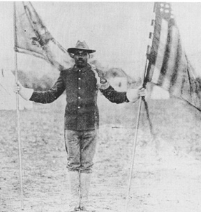 Sergeant George Berry of the 10th Cavalry who planted the colors of the 10th Cavalry on San Juan Hill, Cuba, 1 July 1898. [ He is holding those same colors and standing in front of the headquarters at Huachuca.]
