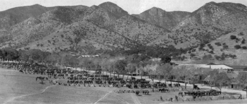 The regiment as a whole passed through the ordinary training cycle during the year, with maneuvers to match. May 9-13 found the regiment operating with planes from the 2d Division in working out problems of coordination and cooperation and the use of cover. During the march to Douglas for the Defense Day ceremonies, the squadrons were pitted against each other for maneuvers in driving one another through the various canyons of the Huachucas.... Patrols were sent out from 60 to 70 miles on successive days. September 10-25 was spent in regimental maneuvers in the vicinity of Ash Canyon. There followed joint maneuvers with our rivals, the 25th Foot. [The 25th Infantry Regiment was stationed at Camp Stephen D. Little at Nogales at this time.] Unbiased members of the press tossed laurels to the 10th Horse, much to the dejection of the Doughboys. The 72-hour continuous problem that initiated the relations proved hectic to the self-termed Sore Feet, but left us jaded. Less fatiguing problems ensued until all terminated in the annual tactical inspection by the Corps Area Commander. Comments and criticisms by the Corps Area Commander and his staff were very complimentary concerning the training and efficiency of the regiment.