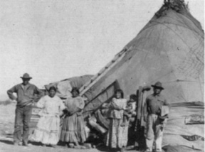 The scouts remained rugged individualists to the end. Only one of the last twelve scouts spoke English. All were very large, well built men. Not only were they excellent horsemen, but foot marches of up to 85 (?) miles in a single day are recorded. Individually and as a unit they were fine soldiers, but they never gave up many of their tribal ways. Until the mid-thirties they lived with their families in tepees which were located in an area of the garrison some distance apart from the other troops. When the WPA (Works Projects Administration) offered to improve their housing conditions, the post commander at Fort Huachuca enthusiastically set about building adobe houses for the.Indians. An impressive dedication was held to celebrate the movement of the Indian families into their new quarters. Great was his consternation to find soon thereafter that all the families had moved back into tepees and that the scouts' horses were the only occupants in the new quarters.(66)