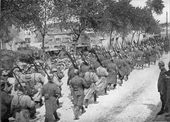 Soldiers marching by American Ambulances in a Flemish