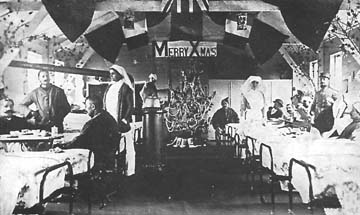 The men had a wonderful Christmas day. They were like a happy lot of children. We decorated the wards with flags, holly, mistletoe, and paper flowers that the men made, and a tree in each ward. You cannot imagine how pretty they were. Each patient began the day with a sock that was hung to the foot of their bed by the night nurses. In each was an orange, a small bag of sweets, nuts and raisins, a handkerchief, pencil, tooth brush, pocket comb and a small toy that pleased them almost more than anything else, and which they at once passed on to their children. They had a fine dinner: jam, stewed rabbit, peas, plum pudding, fruit, nuts, raisins and sweets. The plum puddings were sent by the sister of one of the nurses.