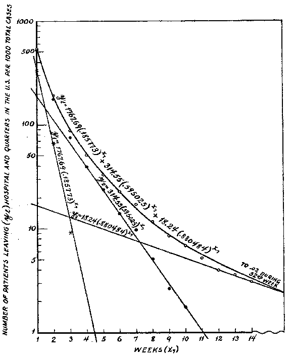 In graduating the Leaving material, Y1 designates the number of patients leaving during each week (x7) ; and likewise in graduating the Remaining data, Yr equals the number of patients remaining at the end of each week (x7) --- Where x represents a period of one week, or seven days, it is written x7; and where it represents a five day period, x5.