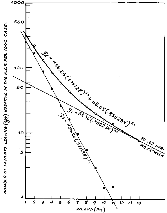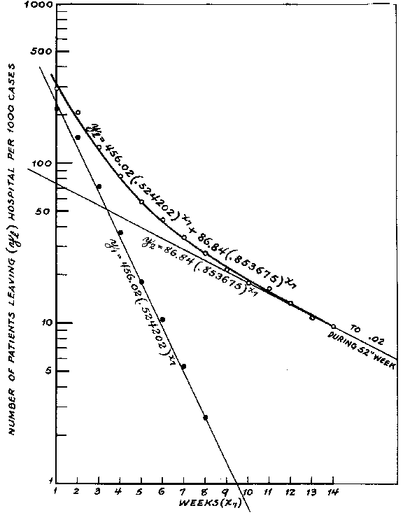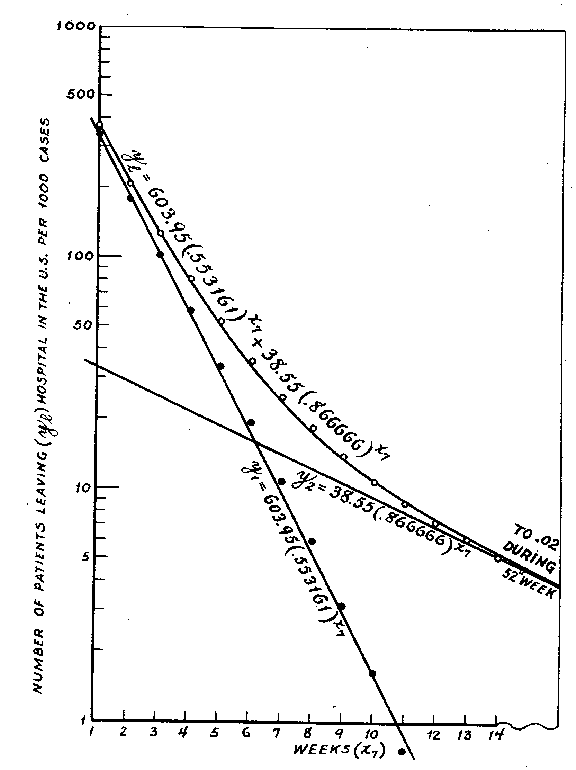 b. Two section curve. --- In another class of cases, such as hospital cases of disease and nonbattle injury patients, certain ones like compound fractures of the femur and pulmonary tuberculosis which required prolonged treatment, were not in the proper proportion to those needing only a few days in hospital to permit of a fit by a one section curve. In such instances there were relatively more short than long duration cases, and a two section curve was required with the general formula