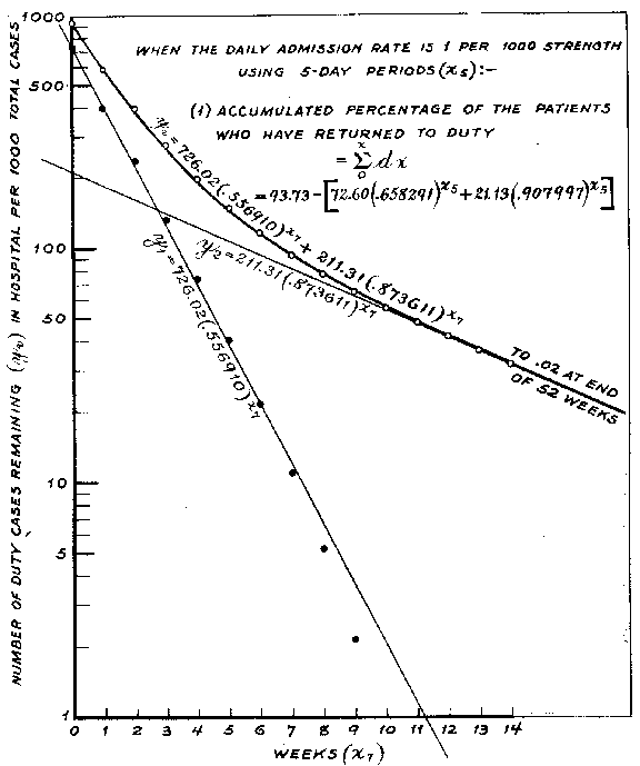 54. Graduation of material. --- In some instances attempts were made to fit this basic material to second or third order parabolas and also to Pearsonian curves, but the results were not satisfactory. It soon became apparent that there was a very definite geometrical progression relationship between the groups of cases leaving sick report by time intervals or remaining on it, and that all of the curves were exponential in character. Inspection showed that this type of curve fitted the observed points quite well with only a few exceptions. The apparent failure to fit was due usually to imperfections in, or incompleteness of, the basic material; but in some instances, the necessity of relating the graduated data to those from other curves resulted in the use of a poorer fit than could have been obtained otherwise.