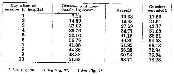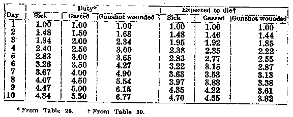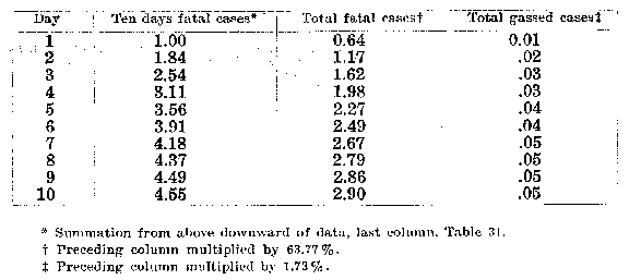 b. In the second place, only 1.73 % of all gassed cases treated in hospital are fatal. Consequently to translate the data to the basis of 1.00 gas admissions per day, the 2.90 must be multiplied by 1.73%. The result shows that there are .05 (2.90 x 1.73%) gassed cases in hospital on the tenth day in a group of such cases that will die within ten days, when the daily admission rate from war gases is 1.00 (see Table 27).