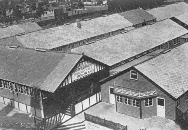 Outside a baseball game is exciting rivalry between two companies; while near the door of the tent a ring is formed and the men are cheering pair after pair as they put on the boxing gloves and with good humor are learning to take some rather heavy slugging. Poor boys, they will have to stand much worse punishment than this before the winter is over. Just beside the present tent there is being rushed into position a big Y M CA hut which will accommodate temporarily a thousand men, before it is taken to pieces and shipped to some new center. The Association has ordered from Paris a number of permanent pine huts, 60 by 120 feet, which will accommodate 2,000 soldiers each, and keep them warm and well occupied during the long cold winter evenings that are to come. On the railway siding at the moment are nine temporary huts, packed in sections for immediate construction, and a score of permanent buildings have been ordered to be erected as fast as the locations for the camps are selected by the military authorities. Indeed, the aim is to have them on the ground and ready before the boys arrive and take the first plunge in the wrong direction.