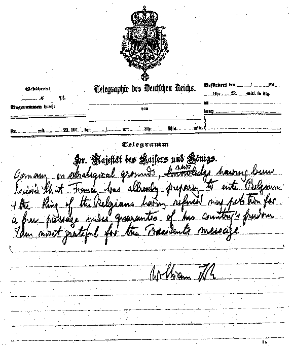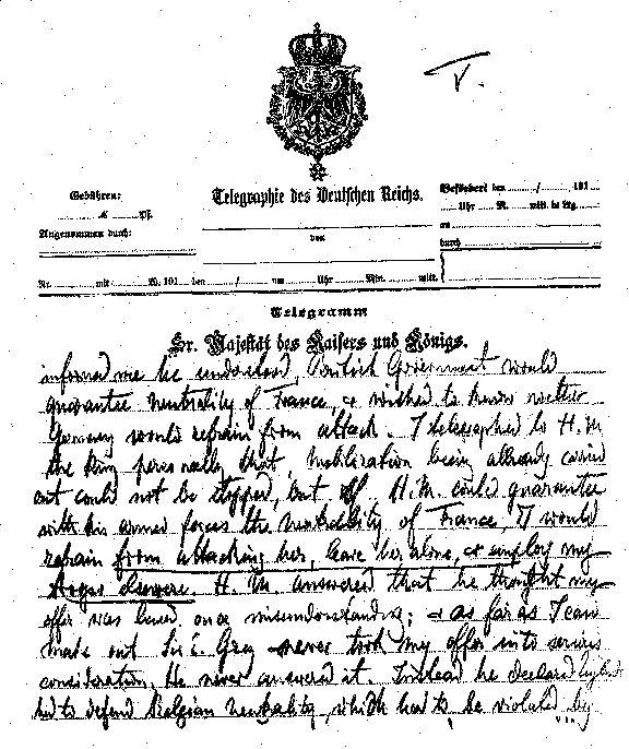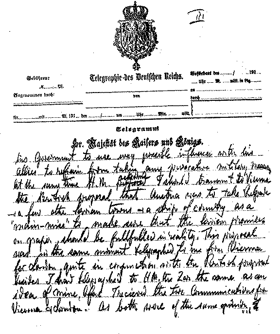 | THIS AND THE FOLLOWING FIVE PAGES ARE A FAC-SIMILE REPRODUCTION OF THE TELEGRAM IN THE KAISER'S OWN HANDWRITING WHICH HE GAVE AMBASSADOR GERARD TO CABLE TO PRESIDENT WILSON (SEE PAGE 200) | |