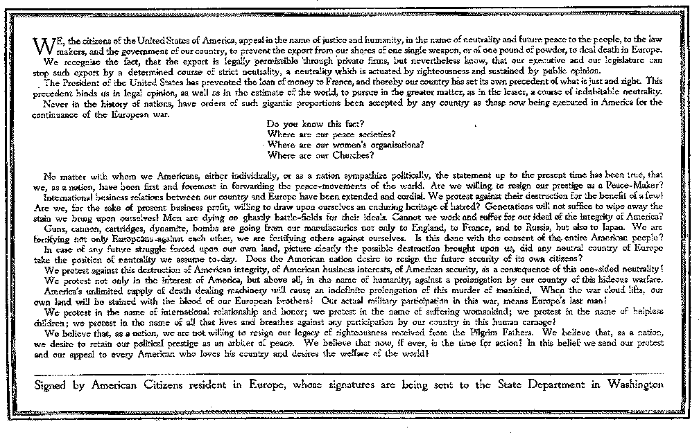 | A PETITION TO THE PRESIDENT OF THE UNITED STATES, CIRCULATED FOR SIGNATURES AMONG THE AMERICANS IN EUROPE, OSTENSIBLY TO PROTEST AGAINST THE AMERICAN MANUFACTURE OF MUNITIONS OF WAR | |