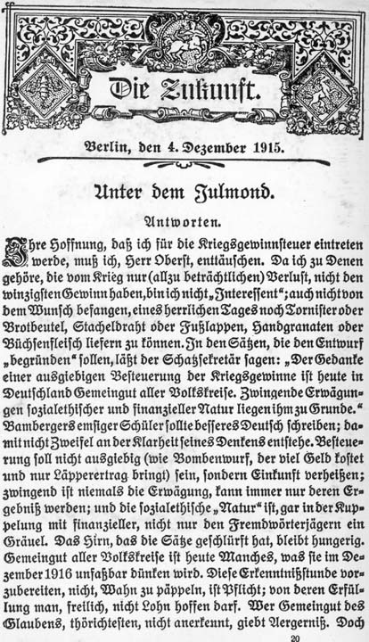 | EXACT SIZE REPRODUCTION OF A PAGE OF THE FAMOUS "DIE ZUKUNFT" PUBLISHED BY MAXIMILIAN HARDEN, THE ONE UNCENSORED EDITOR OF GERMANY | |
