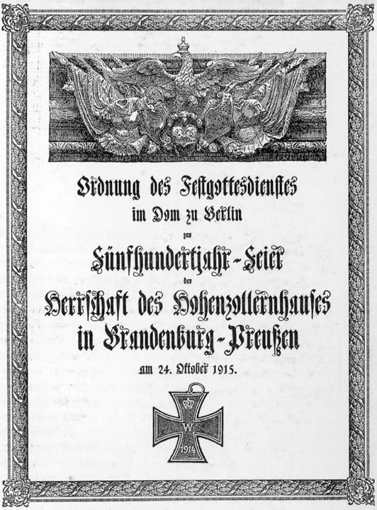 | COVER OF A PROGRAM OF SERVICE IN PROTESTANT CATHEDRAL, BERLIN, IN CELEBRATION OF THE FIVE-HUNDREDTH ANNIVERSARY OF THE LORDSHIP OF HOHENZOLLERNS IN BRANDEBURG-PRUSSIA |
