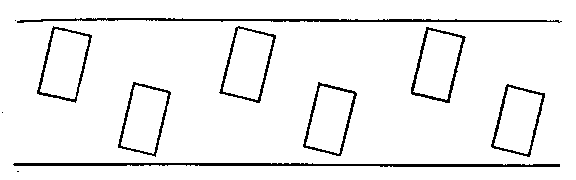 The Avenue de Tervueren, a broad boulevard with a parkway down the centre, is the most direct way into town from the scene of the fighting, and there has been a general belief that the Germans might rush a force into town in motors that way. In order to be ready for anything of the sort, a barricade has been made of heavy tram cars placed at right angles across the road, so that they do not absolutely stop traffic, but compel motors to slow down and pick their way, thus: