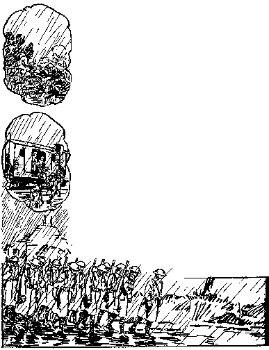 The gleam of a watch on some one's wrist, The roar of the plane and tinkle of rain, The hushed stillness as we stopped near a road, Cries for first aid, the shrieks of the mules, The sea of red mud thru which we hike, The clammy dampness of rain on the skin, The trip all alone from a runner's post, The waiting for dawn with heart dulled by pain, The men continually bunching together, The double-whirred roar of Jerry's plane, Then the solemn promise to see his folks, |