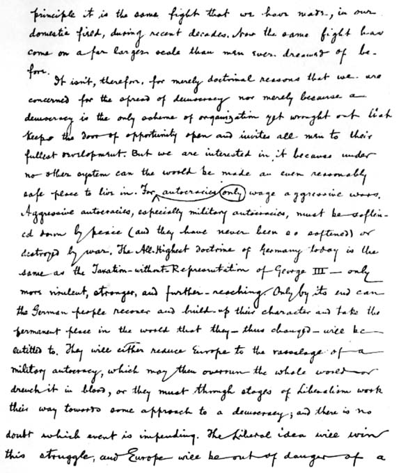 2. As the world stands, the United States and Great Britain must work together and stand together to keep the predatory nations in order. A League to Enforce Peace and the President's idea of disentangling alliances are all in the right direction, but vague and general and cumbersome, a sort of bastard children of Neutrality. The thing, the only thing is---a perfect understanding between the English-speaking peoples. That's necessary, and that's all that's necessary. We must boldly take the lead in that. I frankly tell my friends here that the English have got to throw away their damned arrogance and their insularity and that we Americans have got to throw away our provincial ignorance ("What is abroad to us?"), hang our Irish agitators and shoot our hyphenates and bring up our children with reverence for English history and in the awe of English literature. This is the only job now in the world worth the whole zeal and energy of all first-class, thoroughbred English-speaking men. We must lead. We are natural leaders. The English must be driven to lead. Item: We must get their lads into our universities, ours into theirs. They don't know how to do it, except the little driblet of Rhodes men. Think this out, remembering what fools we've been about exchange professors with Germany! How much good could Fons Smith(150) do in a thousand years, on such an errand as he went on to Berlin? And the English don't know how to do it. They are childish (in some things) beyond belief. An Oxford or Cambridge man never thinks of going back to his university except about twice a lifetime when his college formally asks him to come and dine. Then he dines as docilely as a scared Freshman. I am a D. C. L. of Oxford. I know a lot of their faculty. They are hospitality itself. But I've never yet found out one important fact about the university. They never tell me. I've been down at Cambridge time and again and stayed with the Master of one of the colleges. I can no more get at what they do and how they do it than I could get at the real meaning of a service in a Buddhist Temple. I have spent a good deal of time with Lord Rayleigh, who is the, Chancellor of Cambridge University. He never goes there. If he were to enter the town, all the men in the university would have to stop their work, get on their parade-day gowns, line-up by precedent and rank and go to meet him and go through days of ceremony and incantations. I think the old man has been there once in five years. Now this mediævalism must go---or be modified. You fellers who have universities must work a real alliance---a big job here. But to go on.