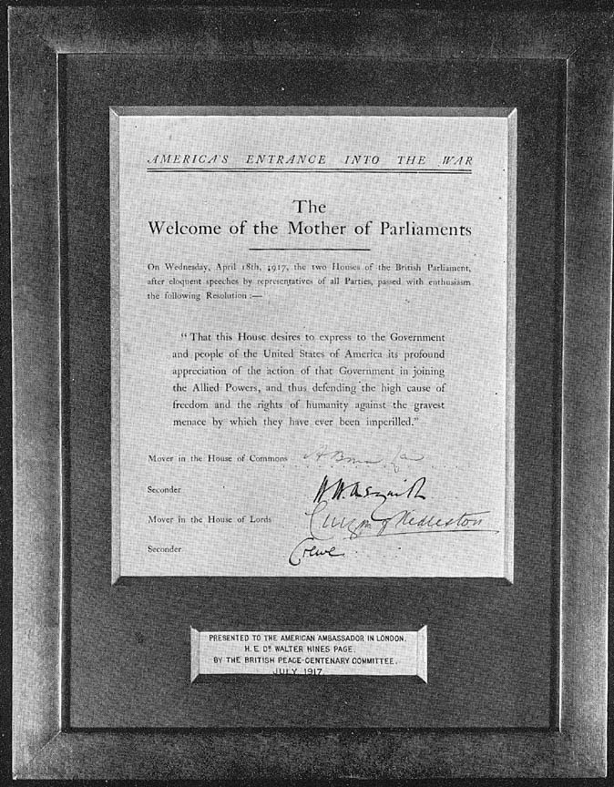 | Resolution passed by the two Houses of Parliament, April 18, 1917, on America's entry into the war | |