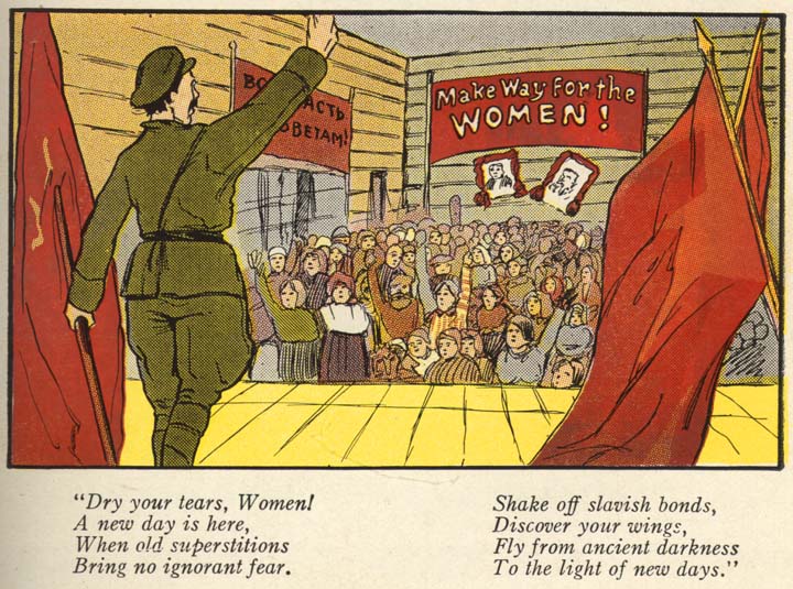 Now it had come and she was sitting among her own, with hands clasped in the hand of her young disciple. True, industry was in ruin, the Germans were at the gates, and hunger and, cold walked thru the city, yet as she sat in the ancient Hall of Nobles, listening to Lenin, she was seeing the new day coming, bringing peace to all people and to her a chance to live on the land.