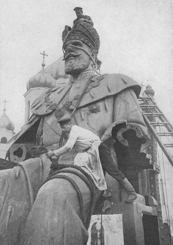 Obliterating the Past. Colossal statue of Czar Alexander III being dismantled after the Soviet came into power. Note the workman at extreme top fixing rope on the crown.