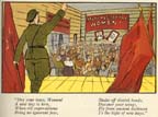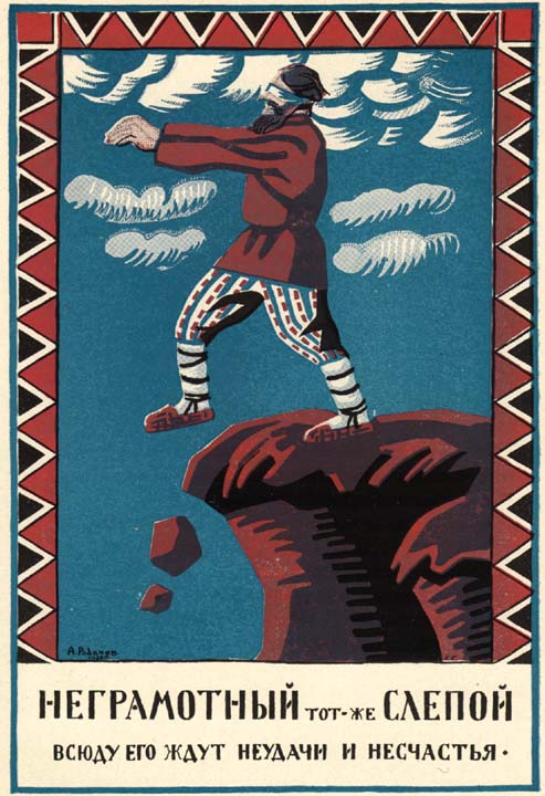 "THE ILLITERATE IS A BLIND MAN: EVERYWHERE PITFALLS AND MISFORTUNES AWAIT HIM."---SOVIET POSTER TO ENCOURAGE EDUCATION.