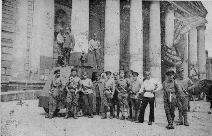 Bolsheviks with one of the armored cars that quelled the White uprising. The cars were christened Proletariat, International, The Red Commune, Lenin, etc.
