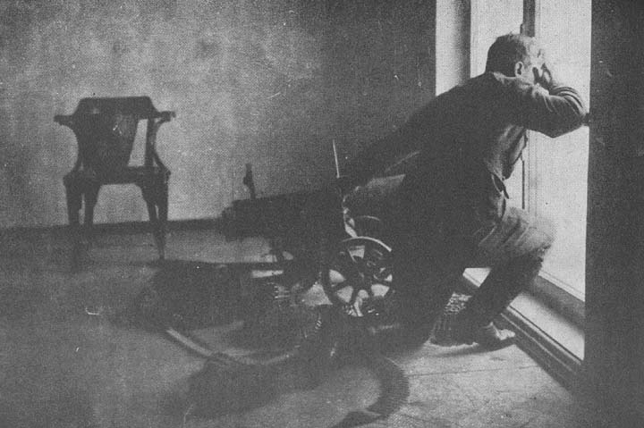Fighting from doors and windows in the War of the Reds and the Whites. Despite the rat-tat-tat of the machine-guns, the theatres and market-places were crowded.