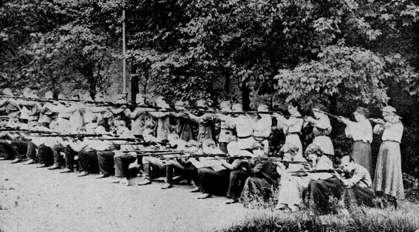 About sixty men joined the detachment. Amongst them was Charles Kuntz, heretofore a Tolstoyan with scruples against killing even a chicken. Now that the Revolution was in peril, he threw over his pacifism and took up a gun. A tremendous change, to convert a fifty year old philosopher into a soldier. In target practise his rifle would get tangled in his beard, but once his bullet hit the bull's-eye and his eyes glistened with joy.