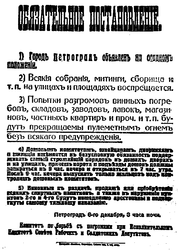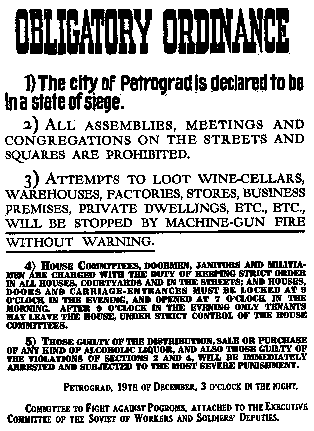 "Citizens," they declared, "no violation of revolutionary order! No thefts nor brigandage! Following the example of the Paris Commune, we will destroy any looter or instigator of disorder." To meet this crisis this placard was posted: