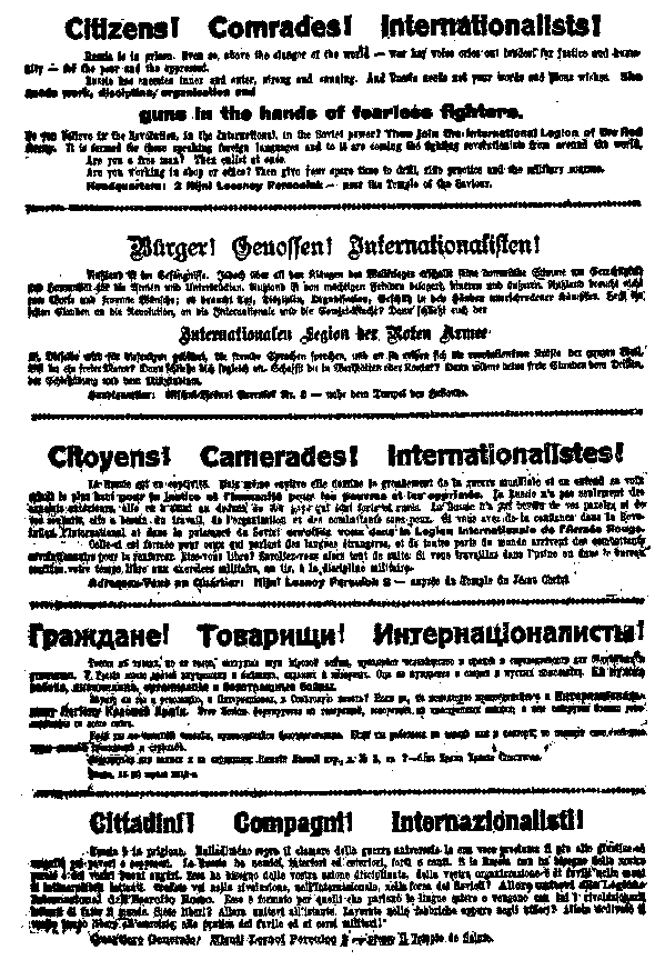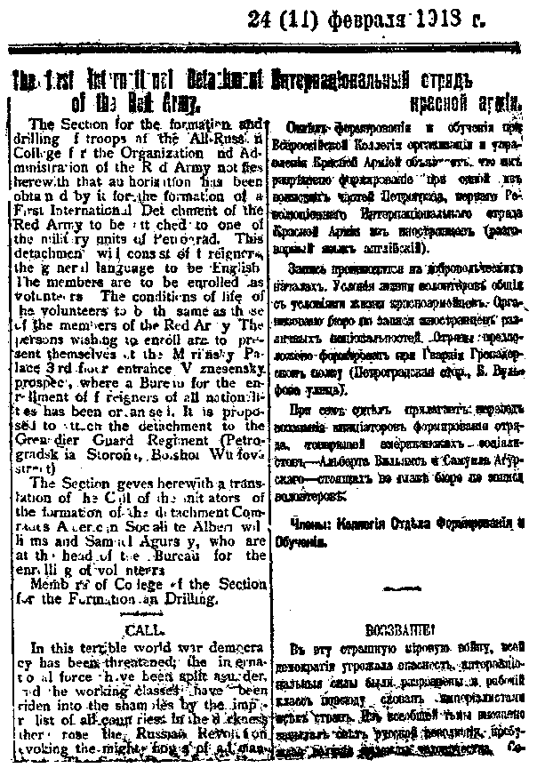 No one can exaggerate the magnitude of the task of reorganizing a new society. Some of the obstacles I glimpsed in one department---the military. Trotzky had just flung into the face of General von Hoffman his: "You are writing with the sword on the bodies of living nations" and had refused to sign the First Treaty of Brest-Litovsk. The Germans then started a sudden drive on Petrograd. I joined the Red Guards for the defense of the city. Hearing this, Lenin suggested that I form a foreign detachment. Pravda printed our "call" in such English type as they could muster. (See reproduction of this on right.)