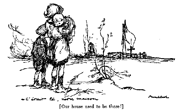 There is no longer a station at Hombleux, because the Germans destroyed it. One therefore paces the platform and stamps one's feet with the cold. Down the track, from the direction of Canizy, the headlight of the engine will presently emerge. All about, the plain lies white and level; the break in the hedge where a footpath crosses the tracks to the village is almost visible. In fancy, I take it, past a fire-gutted farm house and eastward on a long curve across fields where the snow hides an untilled growth of weeds. The highway which parallels the railroad, recedes in a perspective of marching trees, till, topping a little rise, a wooden scaffold stands clear against the sky. It was formerly a German observation post. To the left, equally gaunt, rises the Calvary which marks the entrance to the village. And beyond, cupped in a gentle declivity, lie the ruins of Canizy, framed in snow. So I saw it last; so all the way to Amiens, and from Amiens to Paris, as the train bore me away, I saw it; so in its misery and its beauty, I would picture it to you.