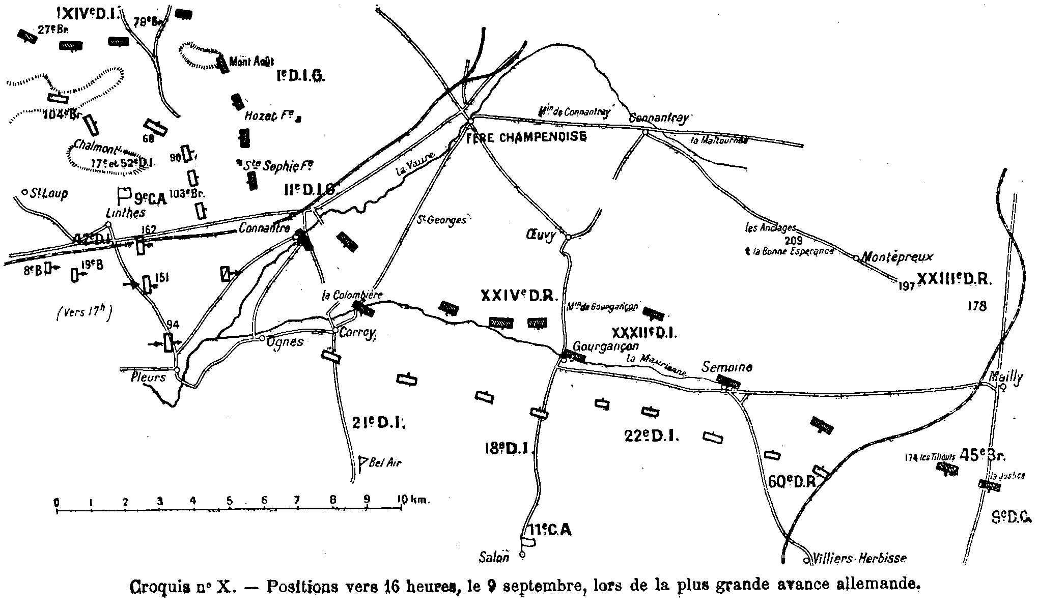X ----Positions vers 16 heures, le 9 septembre, lors de la plus grande avance allemande
