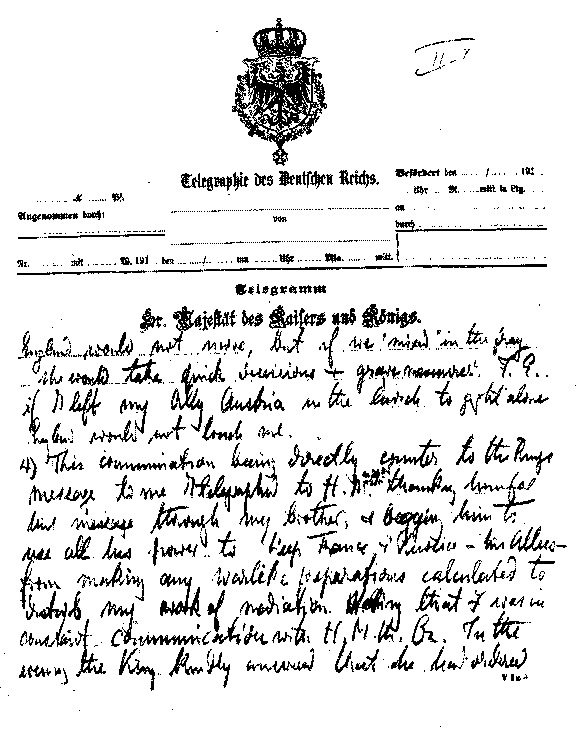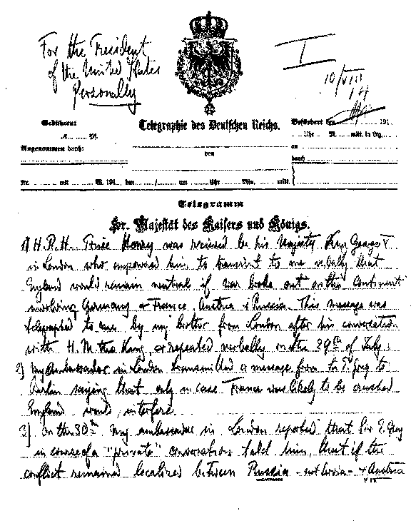 | THIS AND THE FOLLOWING FIVE PAGES ARE A FAC-SIMILE REPRODUCTION OF THE TELEGRAM IN THE KAISER'S OWN HANDWRITING WHICH HE GAVE AMBASSADOR GERARD TO CABLE TO PRESIDENT WILSON (SEE PAGE 200) | |