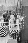The affair was something unforgettable. There stood the great 9000-tonner, ready to glide down the ways into the sea. Standing on the launching platform, waiting for the signal to crash the bottle of wine on the prow of the vessel, was Mrs. Helen Frances (Costigan) Cohan. At her side stood her famous son, George. I was very much impressed by the marked devotion and attention which he showed to her. While last minute preparations were in progress, Mrs. Cohan reminisced a bit and related to me that the last time she had been in Bristol was some twenty-five years previous, when she and her husband, with George and his sister, Josephine (since deceased), were travelling through that section of Pennsylvania, performing at "one-night stands" and doing a skit which the father and mother played. As the ship started to move slowly down the ways I saw a tear launched simultaneously down her cheek.