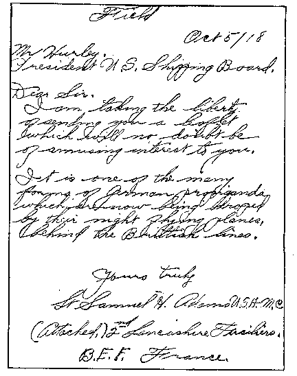 Thus our course of taking desperate chances, of building on hopes as well as in shipyards, receives its justification from German authority. In July the Allied commanders believed that the war would continue until 1919, but conditions changed. With 250,000 American soldiers landing in France monthly and Foch absolutely satisfied regarding the fighting qualities of our men, that great soldier decided to make a general attack on the entire front, thereby bringing the war to a successful conclusion in 1918. The Germans did their best to make propaganda-capital out of our success in providing ships. They dropped leaflets from airplanes behind the British lines, and pictured dire results that would follow the reestablishment of the American Merchant Marine. A copy of one of these leaflets came into the hands of Lieut. Samuel H. Adams, U.S.A.M.C., attached to the Second Lancashire Fusiliers, B.E.F. Lieutenant Adams had a sense of the ridiculous and evidently had been following the development of our ship-building program. I never have had the pleasure of meeting this young officer, but I take occasion here to express publicly my appreciation of his kindness and thoughtfulness in sending me this bit of German propaganda. As he predicted in his letter, I found it a source of "amusing interest." The letter follows: