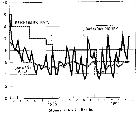 As will be seen from the foregoing diagram, which shows the rate for prime bills on the Berlin private discount market and the rate for day-to-day money in Berlin, the reduction of the bank rate at the beginning of 1927 was followed by a further decline in market rates for money. In part this was the result of the discount rate reduction itself, but it was also the consequence of seasonal forces which ordinarily bring cheaper money in the first weeks of a new year.