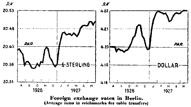 The reversal in the current of money resulting from the various movements outlined above was promptly reflected in the foreign exchange rates. Sterling at the end of December was at or about the point at which it was profitable to ship gold from London to Berlin, and some such shipments had in fact been made. Immediately after the first of the year, however, sterling began to rise, and by the middle of January the exchange on London stood at a marked premium. Simultaneously, the dollar which for a brief period had been below parity with the reichsmark rose nearly to the gold export point. This condition has in general continued up to the present, and such tendencies to recover as manifested themselves from time to time became more feeble as the period advanced. The course taken by sterling and the dollar in terms of reichsmarks since last August is shown in the diagrams below. Prior to August 23, 1926, when the reichsmark was released from its technical adherence to the dollar, the New York quotation stood consistently at 4.20 reichsmarks to the dollar, and the other exchanges moved with respect to the reichsmark in the same sense as they moved with respect to the dollar. It should be added here that the last remaining legal regulation governing foreign exchange transactions was removed by decree on February 22, 1927, when the rule restricting such transactions to legally authorized banking institutions was abolished.