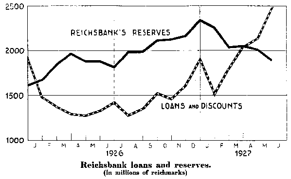 The relative courses taken by the two lines in the foregoing diagram give a fair impression of the way in which the loss of gold and devisen has been met., without causing thus far any general contraction in the volume of credit. The line representing the reserves takes account only of the gold and devisen cover for the note issue as reported in the Reichsbank's quarter-monthly statements, and necessarily leaves out of account the unreported devisen. Except for a brief period in the spring of 1926, the reserves rose steadily, and, as for example in December, at times very sharply. The decline in the reported reserves took place mostly in January and February, 1927, with a further reduction in May. The five months of decline rather more than offset the five previous months of rise, and the reserves are now somewhat below, the level at the end of July, 1926. The second line, representing loans and discounts, takes account of the two items in the Reichs bank statement entitled "Bills and checks" and "Collateral loans." The Reichsbank has ordinarily carried an unstated amount of its unreported devisen in the item "Bills and checks," which during the autumn of 1926 were of sufficient volume to account for twenty to twenty-five per cent of the loans and discounts. After the beginning of 1927 the calls upon the Reichsbank for foreign exchange were such that these unreported devisen were gradually drawn off, but the general level of loans did not fall correspondingly. On the contrary, except for a seasonal decline after the Christmas holidays, the volume of Reichsbank credit has steadily risen, and the portfolio of bills and checks plus the collateral loans stood at a higher point on May 31, 1927, than at any time since the Reichsbank was reconstituted on October 11, 1924. In substance, it appears that the Reichsbank has replaced with domestic credit the full amount of gold and devisen which have been withdrawn from its reserves and from its unreported holdings of foreign currencies. Whereas the Reichsbank's stock of gold and devisen, reported and unreported, is about a thousand millions lower than at the end of last December, the volume of domestic credit granted by it is about a thousand millions higher than it was at that time.