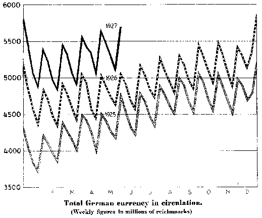 The decline in the Reichsbank's stock of gold and devisen has had no effect thus far upon the volume of the currency. On the contrary, the circulation during the last six months has continued to rise, thereby maintaining the tendency which has prevailed since stabilization. The increase in the circulation has on the whole been remarkably steady, and periods of business inactivity, as for example in the winters of 1925 and 1926, have affected the circulation rather by retarding the rate of increase than by causing a reduction. In the main, as is illustrated in the diagram given below, the rise from month to month has been progressive., and the weekly and seasonal variations of one year have been repeated during the next but on a higher level. The maximum for 1926 was reached as usual at the end of December; the total of 5,830 millions has not yet been exceeded, and it was still somewhat below what was regarded as customary before the war, when the total German circulation fluctuated around 6,000 millions.