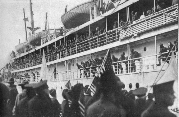 75. The Return of the 15th. Seen on troopship as the 369th Infantry came into New York Harbor bringing back the unique record of never having had a man captured, never losing a, foot of ground or a trench, and of being nearest to the Rhine of any allied unit wher the armistice was signed, and the first detachment of allied troops to reach the Rhine after the armistice.