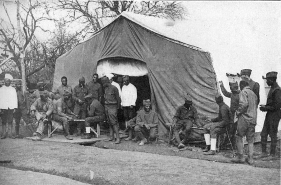 67. Negro Troops in Camp in France. This temporary shelter was not far from the front line. The men are wearing their trench boots and the top of shelter is covered with branches of trees, a form of camouflage intended to prevent detection by enemy aeroplanes.