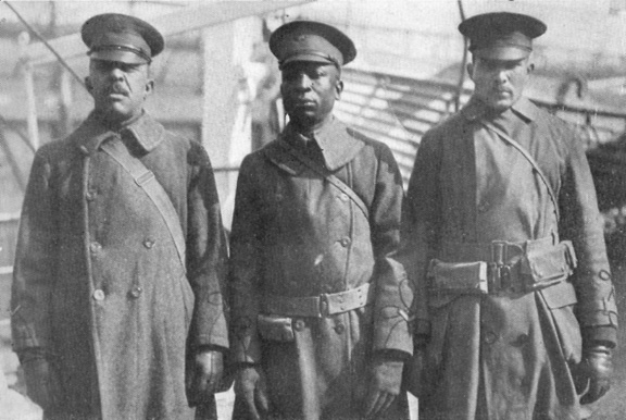 144. Left to Right---Sergeant F. Blue, Drum Major of "The Black Devil's" Band (so-called by Germans) of the 370th Reg. (The old 8th Illinois); Lieut. Thomas A. Painter, 369th Infantry, who received the Croix de Guerre for gallantry in action; Capt. Napoleon Bonaparte Marshall of the 369th Inf., one of Harvard's most famous athletes, severely wounded in spine, during fighting south of Meetx, must wear a steel brace during the remainder of his life.