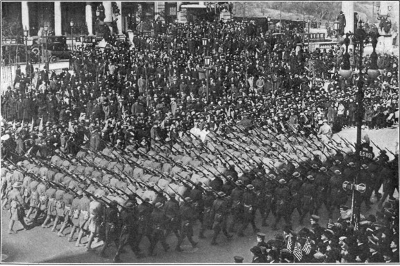 114. Chicago parade of the 370th Regi ment (Old 8th Illinois) passing the reviewing stand in Michigan Ave., where the crowds were so dense that troops could not march in regular formation.
