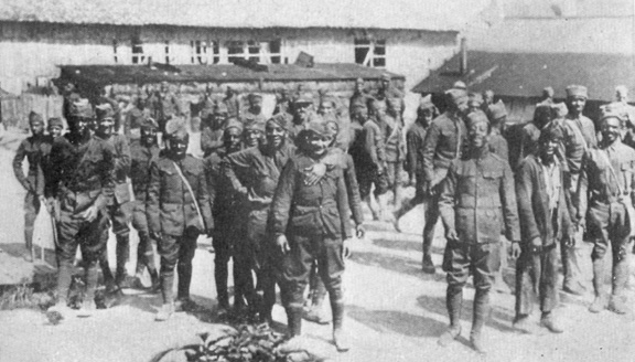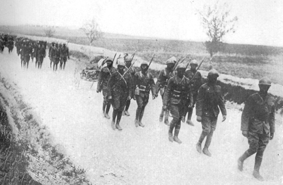 85. Negro troops returning to camp behind the lines after a strenuous day on the Western Front during operations on the Marne.
