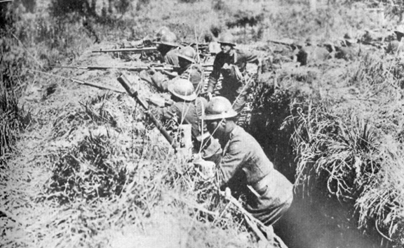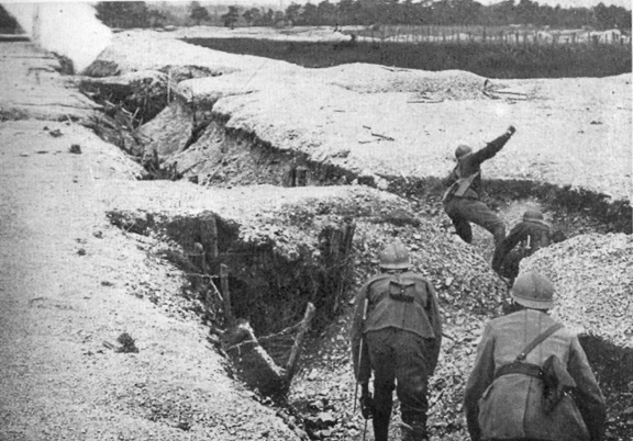 59. American Negro soldiers throwing hand grenades from a French trench into No Man's Land.