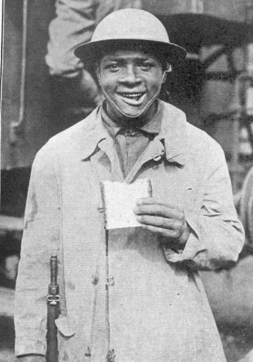 64. He Captured the Kaiser. Corporal Fred McIntyre of the 369th Infantry with the photograph of the Kaiser which he captured from a German officer in his dugout.