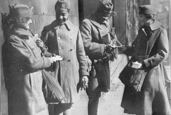 66. The Salvation Army Draws No Color Line. Soldiers of the 351st Field Artillery are receiving candy from Salvation Army lassies on their return to New York.