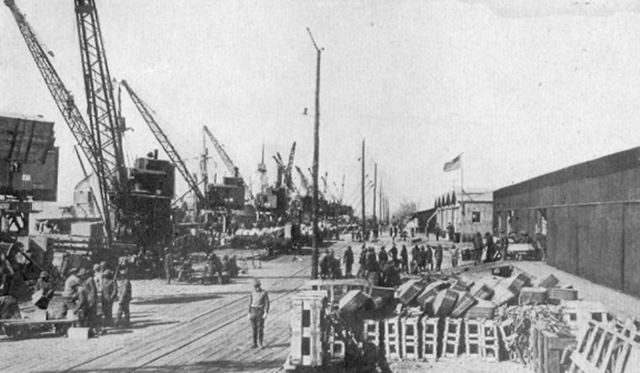 71. One of the Docks at Bordeaux Where Negro Stevedore Regiments Played a Vital Part in the War in Unloading Supplies for Our Troops. Transportation of supplies is just as important a part of war as firing guns at the enemy. All the armies in the world could not have defeated Germany if it had not been for the Service of Supply. getting the guns, ammunition, equipment and food to them.