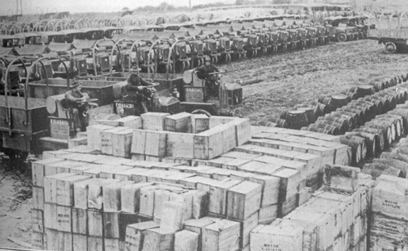 74. It took tens of thousands of motor trucks to get supplies from docks to the front in France. These had to be shipped from America and here are a few in Assembling Yard at St. Nazaire, France, with cases and barrels of gasoline and oil in the foreground. If it had not been for Negro stevedore regiments, these trucks could not have been taken off the ships.