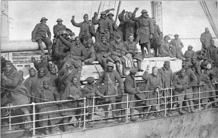 43. How Our Soldiers Came Home. American Negro troops boarding the boat in New York Harbor for Camp Merritt, N. J., mobilization camp.