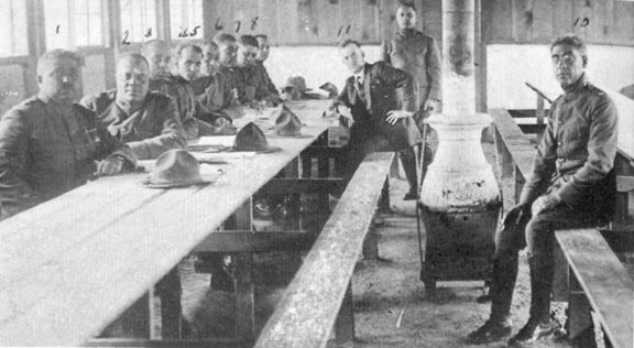 77. The only Negro General Court Martial Board Which Ever Existed. Photograph shows the General Court Martial of the 370th lnfantry (8th Illinois National Guard) convened at Camp Logan, Houston, Texas. Officers in Picture indicated by numbers following: 1-Lieut.F.P. Rose, 2-Capt L Jackson, 3-Cpt. James C. Hall, 4-Capt. George M. Allen, 5-Major (now Lieut. Col ) Otis B. Duncan, President; 6-Capt. Wm. B. Crawford, 7-Lieut C N. Hinton, 8-Lieui. Louis C. Washington, 9-Capt. L. E. Johnson, Counsel for Defense; 10-Lieut. R, A. J. Sulaw, Judge Advocate, 11-Court Reporter McCarty.