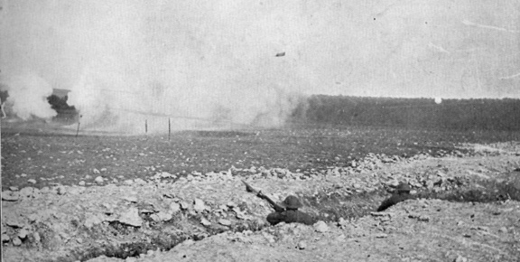 80. In the Trenches. The smoke is from explosion of a hand grenade just thrown by the American Negro Soldier at the right.