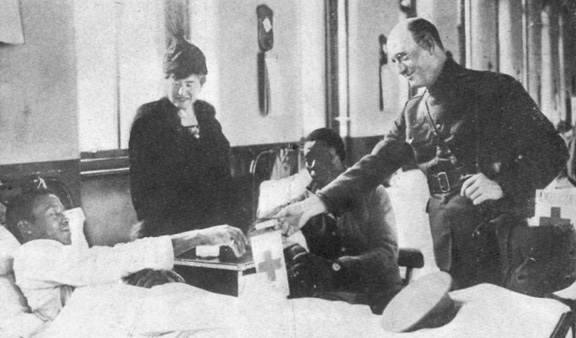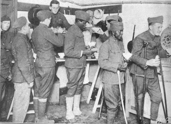 92. American Negro Soldiers In hospital, Glasgow, Scotland, receiving cigarettes and chocolates frorn Red Cross Chaplain Thos. E. Swan and a visit from Mrs. Jas. Gardiner, one of the Red Cross Workers.