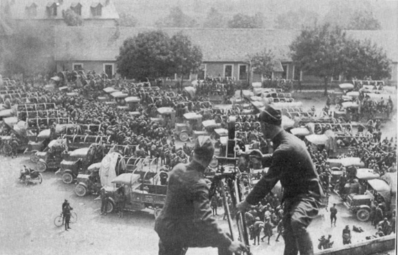 97. Truck Train of 365th Infantry unloadingtroops at Bruyeres. It required the services of 500 big army trucks for three days and nights to transport the 92nd Division from Bourbonne-les-Bains to this point in the Vosges zone.